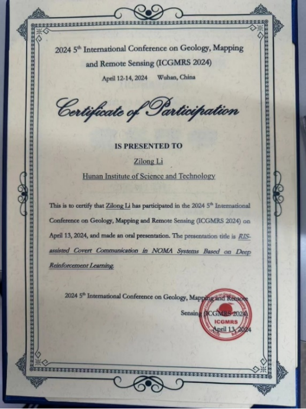 研究生李子龙在会议上作了题为RIS-assisted Covert Communication in NOMA Systems Based on Deep Reinforcement Learning(基于深度强化学习的NOMA系统RIS辅助隐蔽通信)的口头报告。该研究创新性地运用了深度强化学习作为研究工具,提出了不同于传统NOMA系统RIS辅助隐蔽通信的解决方案,是深度强化学习应用的一次新尝试。经过与华中师范大学、中国地质大学和成都理工大学等相关学者的激烈竞争,李子龙最终在现场专家的评选下,荣获该专题会场的优秀口头报告奖项。
