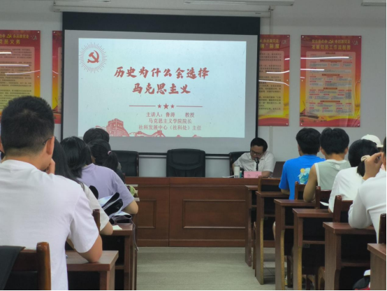 鲁涛向同学们阐述了“学习党史的意义”,引导大家正确认识中国近代社会性质。他为大家介绍了“浅层次器物层面学习”“深层次器物层面学习”“制度层面学习”“文化层面学习”四个中国近代向西方学习的阶段;并从“四种模式、四种道路拯救不了中国人民”和“马克思主义具有其他‘主义’所没有的真理力量”两个角度有力地证明了“马克思主义是历史的抉择”这一观点。