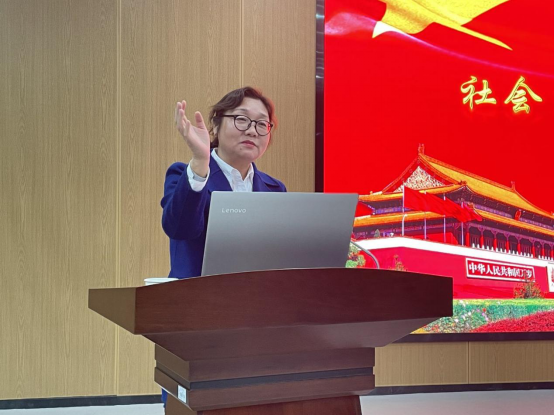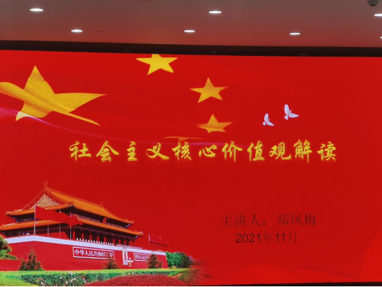 郑凤梅从社会主义核心价值观产生的背景、内涵、践行三方面对社会主义核心价值观进行解读。她通过由古及今、由表及里的方式,介绍历史上不同时期的价值观,解答“什么是核心价值观”,并引出24字社会主义核心价值观。