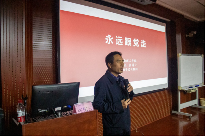 国云《永远跟党走》为题,为什么要入党”、“入党后怎么做两个方面展开讲述。他深入浅出地介绍了中国共产党的光辉历史和中人民共和国发展史。强调广老员工应坚持党的绝对领导坚定理想信念,做到理想信念不滑坡、革命意志不动摇,希望各位同学应从现做起,从身边的每一件具体小事做起,为实现中华民族伟大复兴的中国梦不懈奋斗。