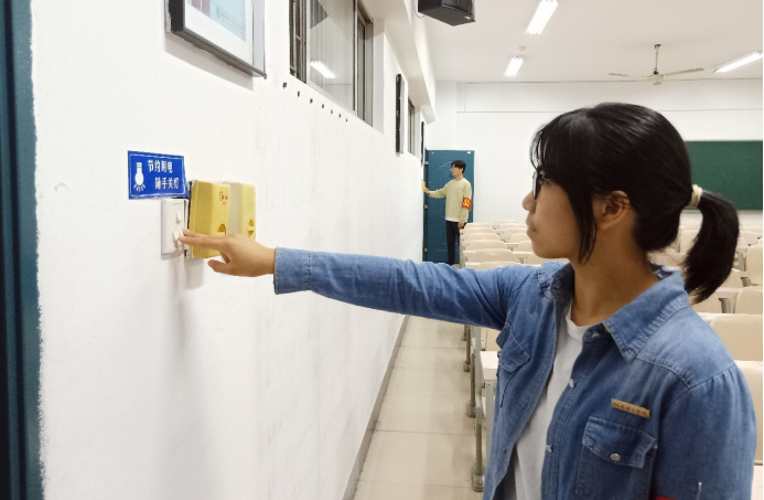 9月22日22:00,在王学鹏老师的带领下两位值班同学徐鹏和张微,对五栋教学楼内尚未关灯的走廊和教室开始清查。从一楼到五楼,在确保楼层无人后,两位同学逐步熄灭走廊和教室的亮灯,偶尔碰见还在教室学习的同学,两位值班同学都会上前小声提醒他们人走灯灭,注意安全。