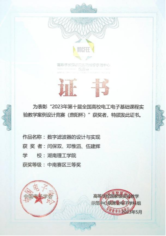 近日,​beats365官方网站电子信息与通信技术国家级实验教学示范中心收到2023第十届全国高校电工电子基础课程实验教学案例设计竞赛鼎阳杯中南赛区获奖证书示范中心教师邓己媛、陈松、刘翔研制“基于MC2833MC13135的窄带通信系统设计与制作”项目闫保双邓惟滔、伍建辉老师的“数字滤波器的设计与实现”项目经激烈角逐分别获二等奖和三等奖。