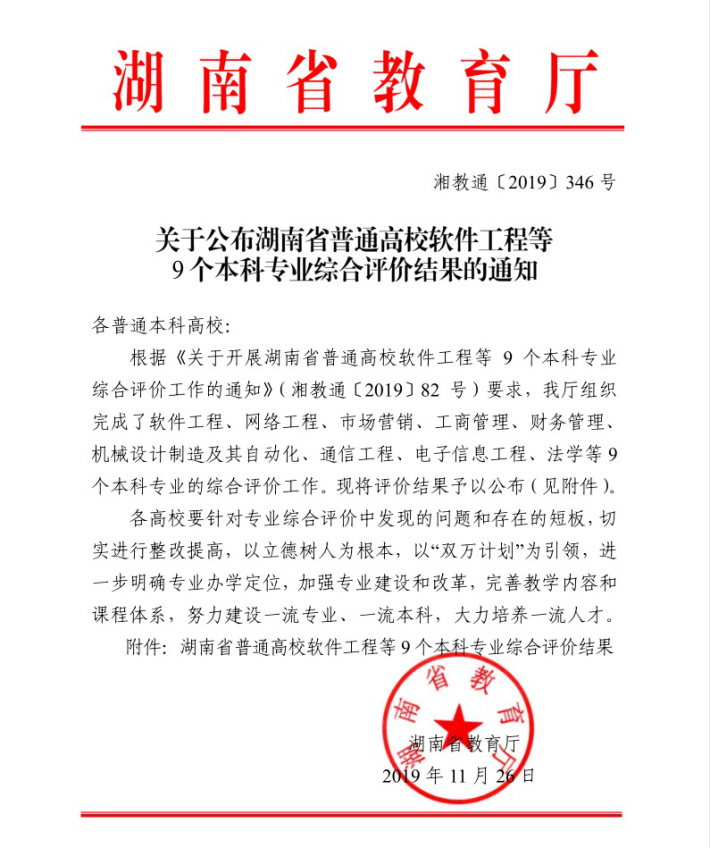 近日,湖南省教育厅发布了《关于公布湖南省普通高校软件工程等9个本科专业综合评价结果的通知》,公司电子信息工程、通信工程专业两个专业参评,双双获评为A等。电子信息工程专业在全省23个参评高校中排名第4,通信工程专业在全省23个参评高校中排名第5。这是公司两轮共7个本科专业参评以来取得的最好成绩。