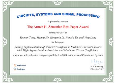 据悉,《Circuits, Systems and Signal Processing》创刊于1982年,由Springer出版,为SCI和EI源刊,主要刊登线性与非线性网络、分布式电路与系统、多维信号处理与系统等研究方向的高水平论文和研究成果,在信息科学领域具有重要影响力和较高声望。该期刊最佳论文评选活动始于2013年,共设立三大奖项,每年评选一次,参评对象为过去两年内发表于该期刊的论文。在2013至2014年该期刊发表的422论文中,8篇优秀论文被期刊提名为2014年度最佳论文,经同行评审委员会表决,最终仅有2篇论文获奖。