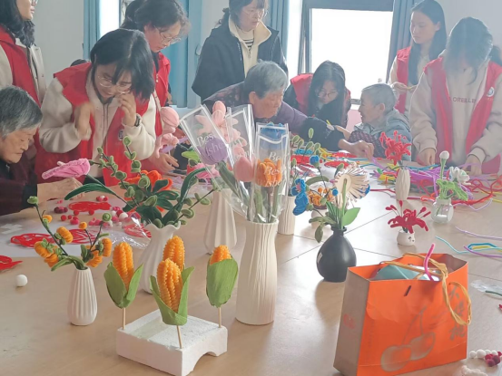 活动伊始,团培志愿者们便融入老人中间,现场气氛迅速升温。在手工区域,老人们沉浸在扭扭棒制作和绘画的乐趣中。与此同时,一场关于“如何记录生活”的互动也在悄然进行。志愿者们不仅是手工老师,更成为老人们的“专属摄影师”和“手机使用顾问”。