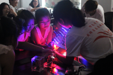 为了让孩子们感受科学的魅力,志愿者们拿出各种电路模型,一边指导孩子们操作,一边简单地讲述其原理,在LED灯亮起来的瞬间,一扇新的大门同时也为这些孩子们敞开。