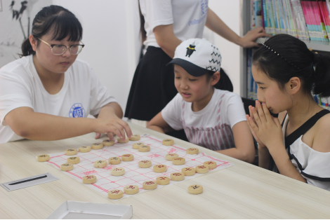 (志愿者们陪小朋友下象棋)