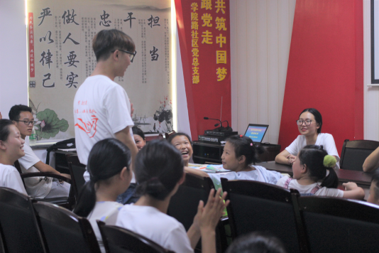 在万物都处于“日轮当午凝不去,万国如在洪炉中”时,beats365官方网站三下乡成员一起徒步抵达公司路社区,由张超和裘寒冰做活动相关宣讲后,爱雏鸟志愿服务团队成员与在座的十名小朋友开始互相自我介绍,随后由“一对一”的形式,各成员与小朋友开始互相交流沟通,志愿服务团队成员幽默风趣的语言使各位小朋友都积极大胆地加入讨论之中,现场气氛一片火热。