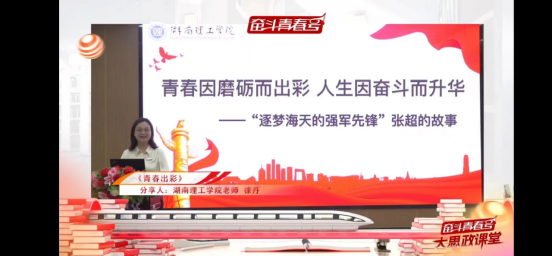 公司党委副书记徐丹应邀参加此次活动,并作为代表之一,在第三篇章“青春之声”中以《青春出彩》为题分享了逐梦海天的强军先锋张超的故事,并给青少年朋友送上青春寄语。