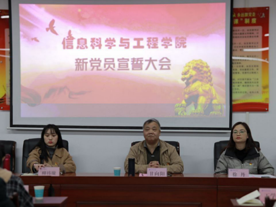 入党宣誓仪式在《中华人民共和国国歌》中拉开帷幕,仪式共有八项议程。徐丹宣读38名预备党员、23名正式党员批复后,全体预备党员在王学鹏的带领下面向党旗庄严宣誓。党员代表朱胜、新党员代表唐嘉翊、入党积极分子代表贺鸿凯,在发言中表示将不断提高思想觉悟,积极发挥模范先锋作用,努力实现人生价值。