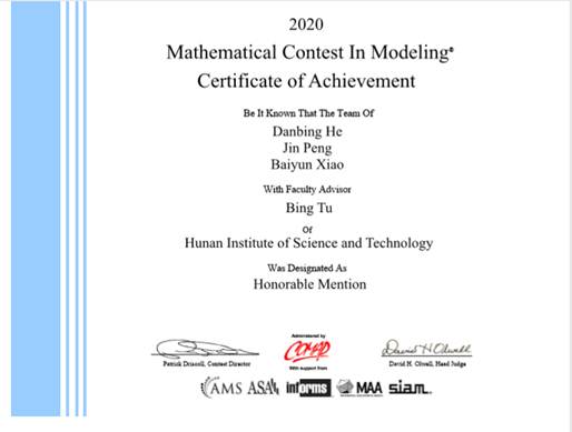 第一次担当“主心骨”,又碰上特殊时期,压力和担子都落在了她的肩上,但何丹冰选择把它扛下来。她提前统筹谋划,安排好比赛进度,协调好队员之间的合作与分工,确保线上沟通的有效率。从3月6日早晨6点开始,在长达4天4夜的时间里,他们以语音通话和视频会议等方式实现讨论和协调,从赛题选择、模型构建、算法设计、程序实现、数据分析总结、论文撰写等各个环节,项目进度丝毫没有受到影响。最终,在今年的美国老员工数学建模比赛中,何丹冰和她的小组取得了国际二等奖的优异成绩。