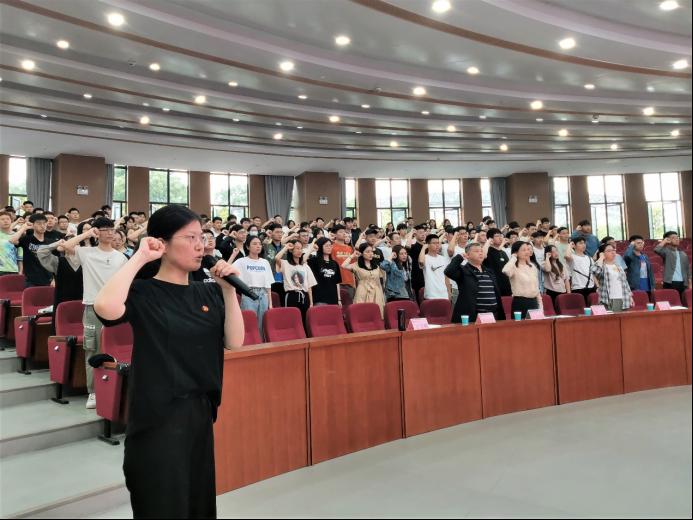 全体毕业生党员在激昂的国歌歌声中肃立合唱国歌接下来由周煊阳带领大家重温入党誓词。优秀毕业生党员代表王逸飞发言时说一名党员就是一面旗帜,要勇于发挥党员的先锋模范作用,积极带动身边的人一起为祖国的未来而奋斗。